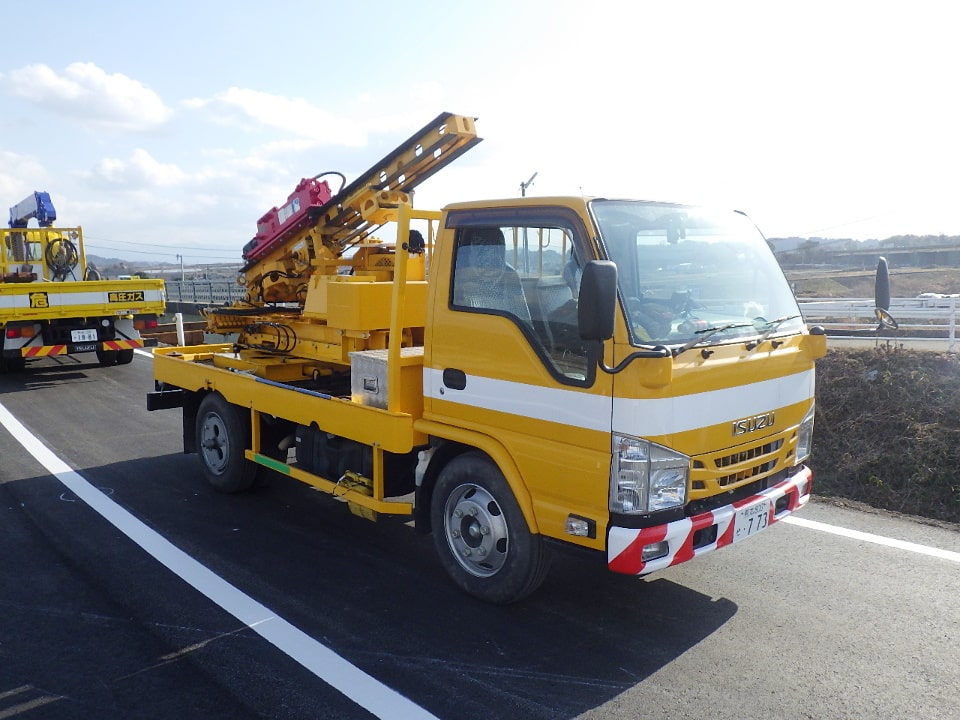 防護柵支柱打込みにあたり支柱位置に岩盤等の支障物があり、支柱打込機械での支柱陥入が出来ない場合に使用する機械です。ダウンザホールハンマで岩盤等の支障物を削岩して防護柵支柱の規定根入長を確保します。