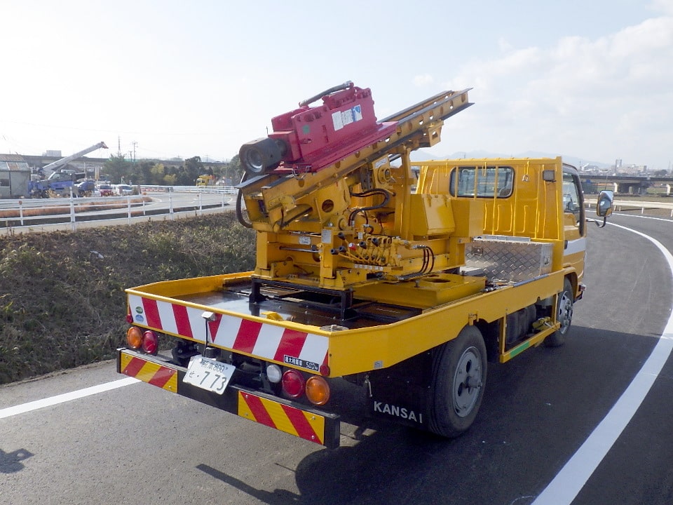 防護柵支柱の打込みに欠かせない専用施工機械であり、精度の高い現場作業が可能です。支柱打込作業から調整作業まで、操作レバーで対応することができます。