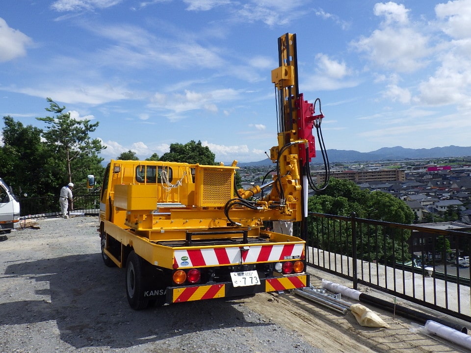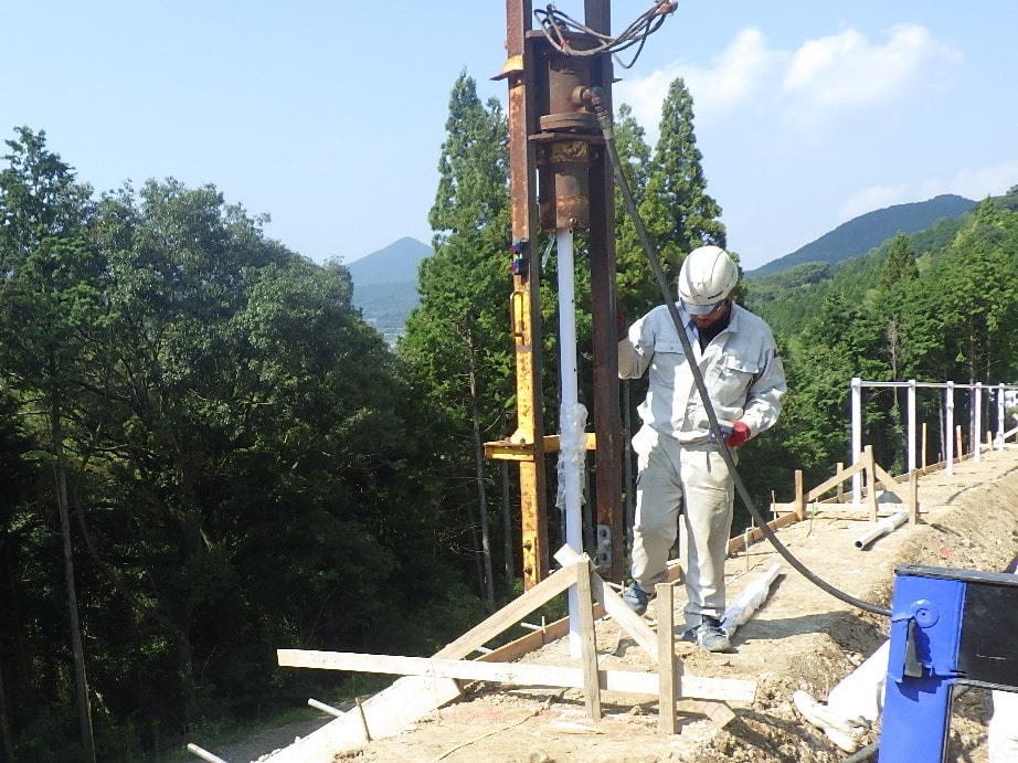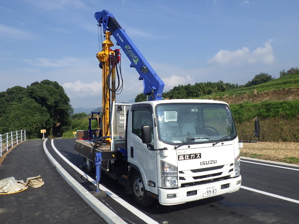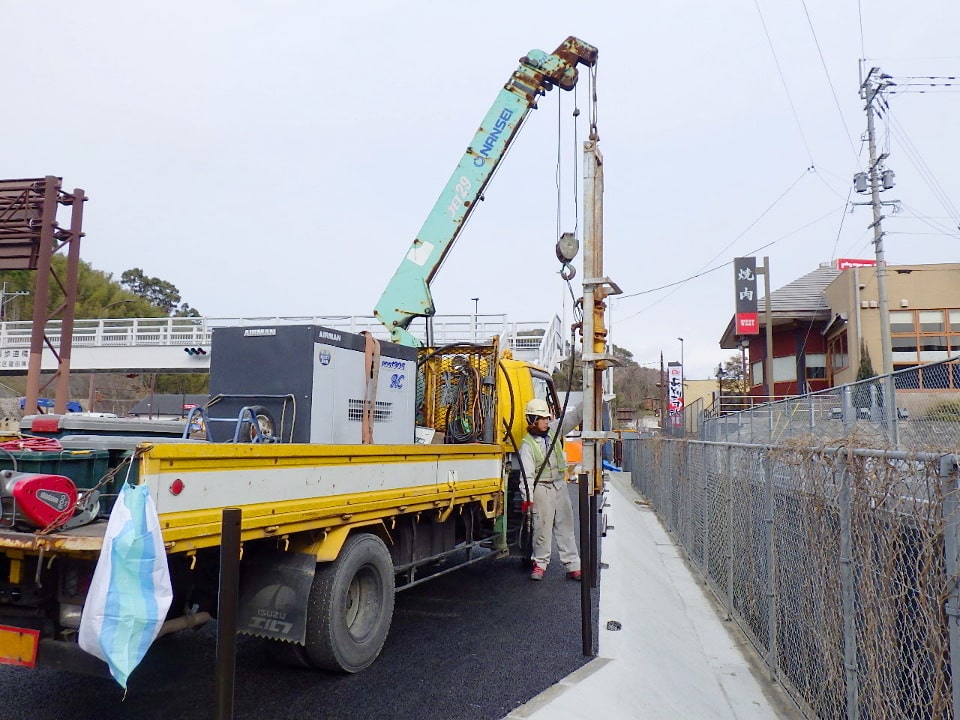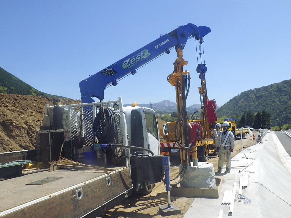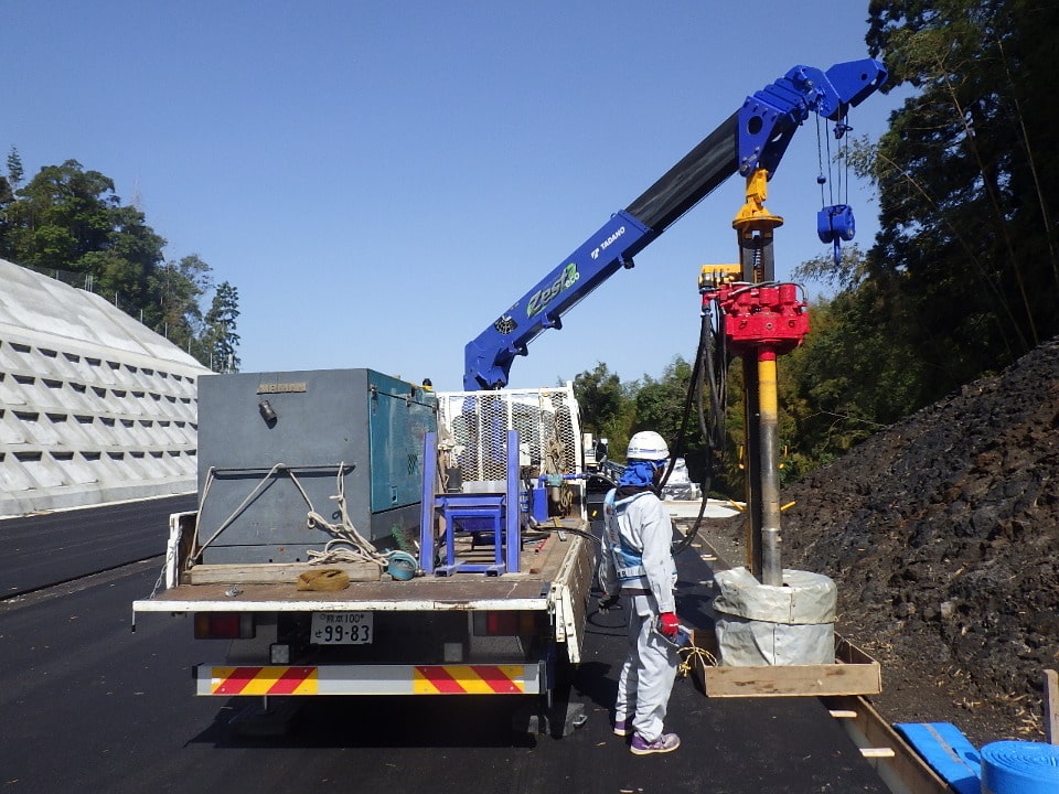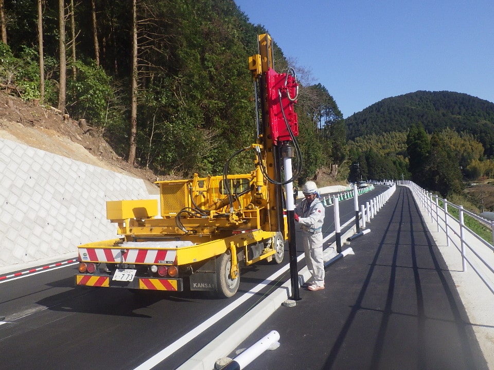 防護柵支柱打込みにあたり支柱位置に岩盤等の支障物があり、支柱打込機械での支柱陥入が出来ない場合に使用する機械です。ダウンザホールハンマで岩盤等の支障物を削岩して防護柵支柱の規定根入長を確保します。